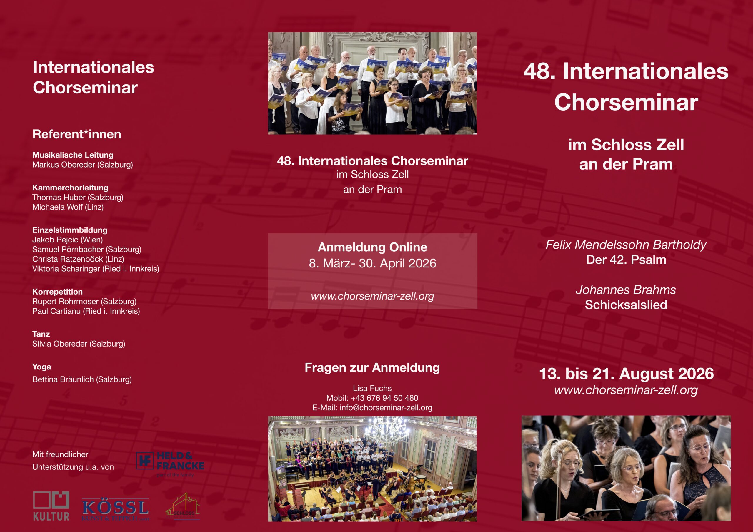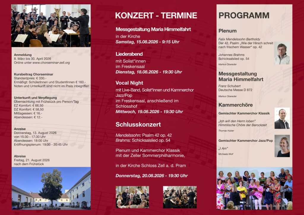 Zum 48. Mal lädt das Internationale Chorseminar ins Schloss Zell an der Pram ein. Willkommen sind geübte Chorsänger*innen, die über solide Grundkenntnisse im Blattsingen verfügen und Freude daran haben, in einer guten Gemeinschaft anspruchsvolle Chorarbeit zu erleben – konzentriert, mit Herz und voller musikalischer Energie.